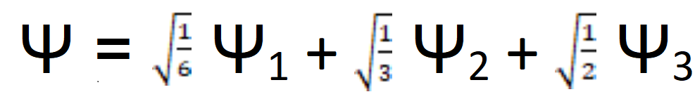 For instance, the square of the first wave function’s coefficient is 1/6. 1/3 and ½ are the square of the second and third functions respectively. When you add them together, 1/6 + 1/3 + ½ = 1= 100%. This makes sense. The particle(s) have to be in one of these states all the time.
